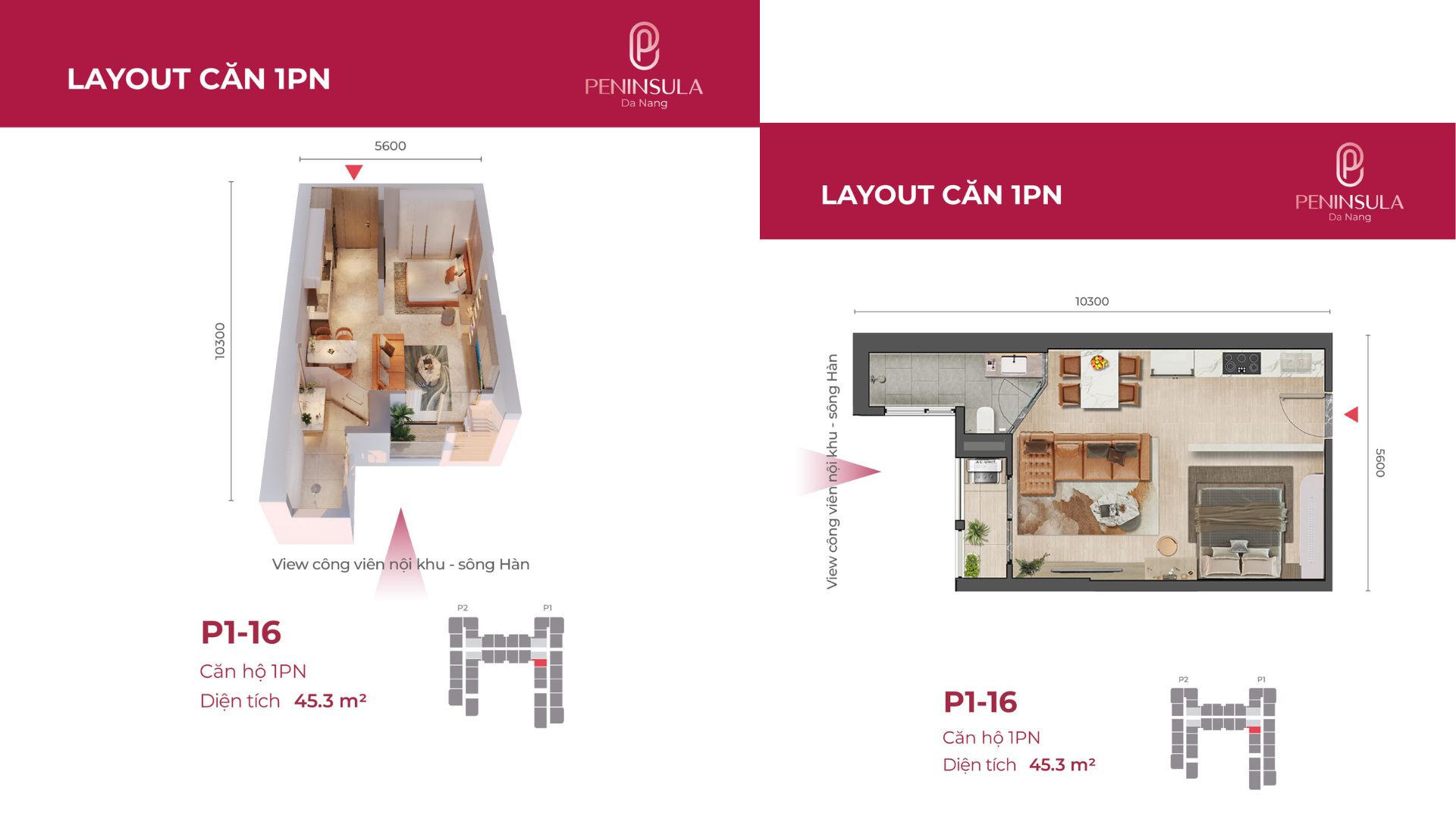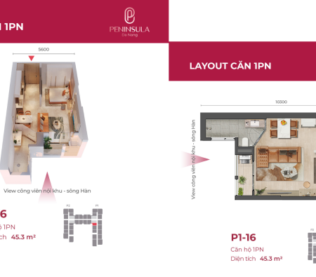 Căn hộ Peninsula 1 phòng ngủ diện tích 45,3m², tầng 12A trung đẹp, thiết kế tối ưu với mặt ngang 5,6m, view nội khu và sông Hàn vĩnh cửu, phù hợp an cư chất lượng hoặc đầu tư cho thuê hiệu quả.